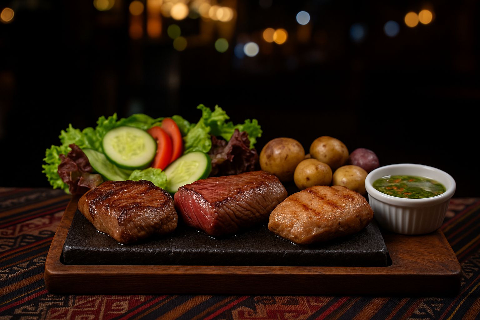 Variedad de entradas, fondos, guarniciones y postres inspirados en el valle sagrado.